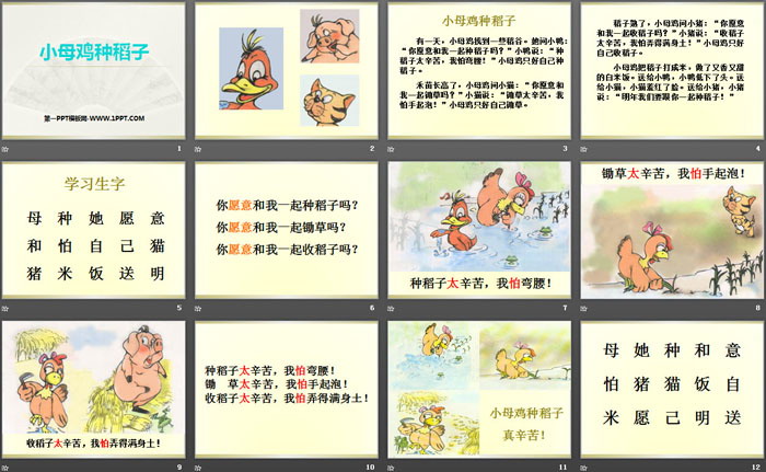 关键词:北师大版一年级上册语文PPT课件免费下载,小母鸡种稻子PPT下载,.PPT格式;