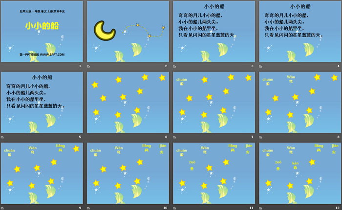 关键词:北师大版一年级上册语文PPT课件免费下载,小小的船PPT下载,.PPT格式;