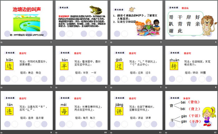 关键词:北师大版一年级下册语文PPT课件免费下载,池塘边的叫声PPT下载,.PPT格式;