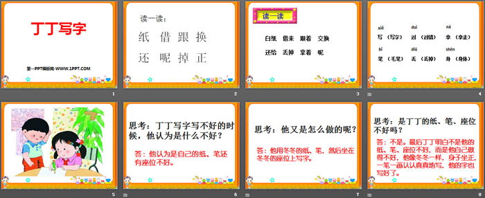 关键词:北师大版一年级下册语文PPT课件免费下载,丁丁写字PPT下载,.PPT格式;