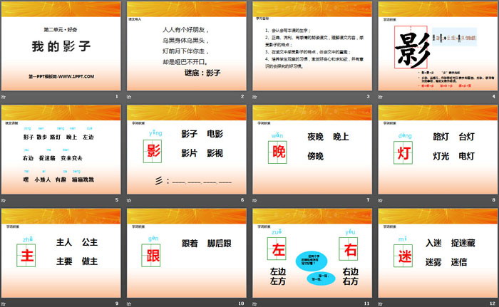 关键词:北师大版二年级上册语文PPT课件免费下载,我的影子PPT下载,.PPT格式;