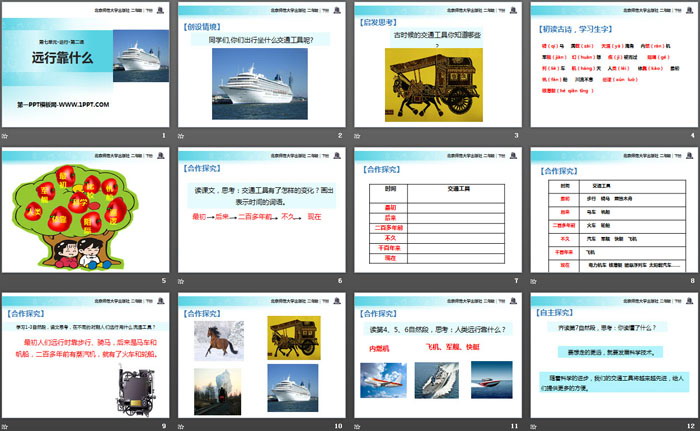 最初人们远行时靠步行、骑马,后来是马车和帆船,二百多年前有蒸汽机,就有了火车和轮船。