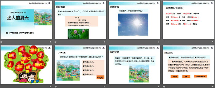 关键词:北师大版二年级下册语文PPT课件免费下载,迷人的夏天PPT下载,.PPT格式;