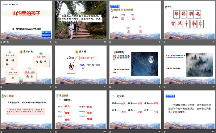 关键词:北师大三年级下册语文PPT课件免费下载,山沟里的孩子PPT下载,.PPT格式;