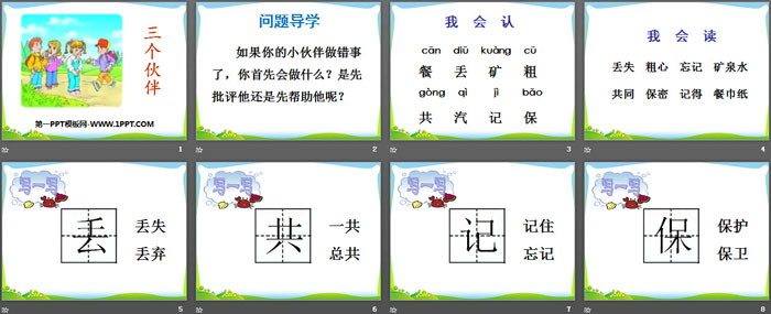 关键词:西师大版一年级下册语文PPT课件免费下载,三个伙伴PPT下载,.PPT格式;