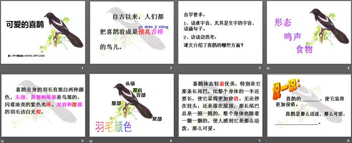 关键词:西师大版一年级下册语文PPT课件免费下载,可爱的喜鹊PPT下载,.PPT格式;