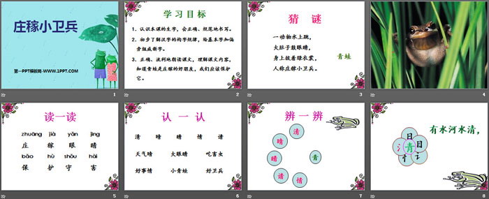3.正确、流利地朗读课文,理解课文内容,知道青蛙是庄稼的好朋友,我们应该保护它。