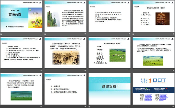 关键词:西师大版二年级上册语文PPT课件免费下载,古诗两首PPT下载,登鹳雀楼PPT下载,敕勒歌PPT下载,.PPT格式;