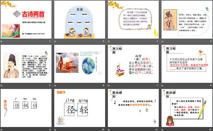 关键词:西师大版三年级上册语文PPT课件免费下载,古诗两首PPT下载,山行PPT下载,九月九日忆山东兄弟PPT下载,.PPT格式;