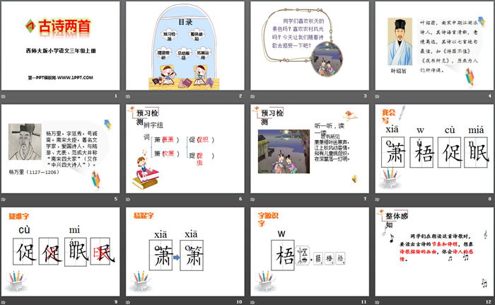 关键词:西师大版三年级上册语文PPT课件免费下载,古诗两首PPT下载,夜书所见PPT下载,茶桑坑道中PPT下载,.PPT格式;