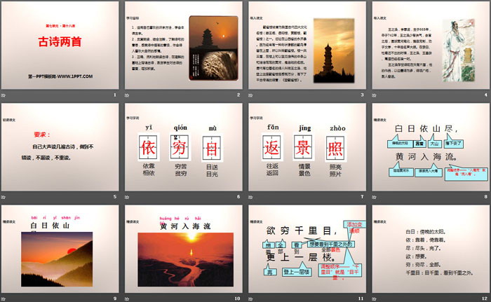 关键词:苏教版二年级上册语文PPT课件免费下载,古诗两首PPT下载,登鹳雀楼PPT下载,鹿柴PPT下载,.PPT格式;
