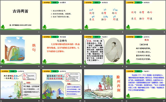 关键词:苏教版三年级下册语文PPT课件免费下载,古诗两首PPT下载,绝句PPT下载,滁州西涧PPT下载,.PPT格式;