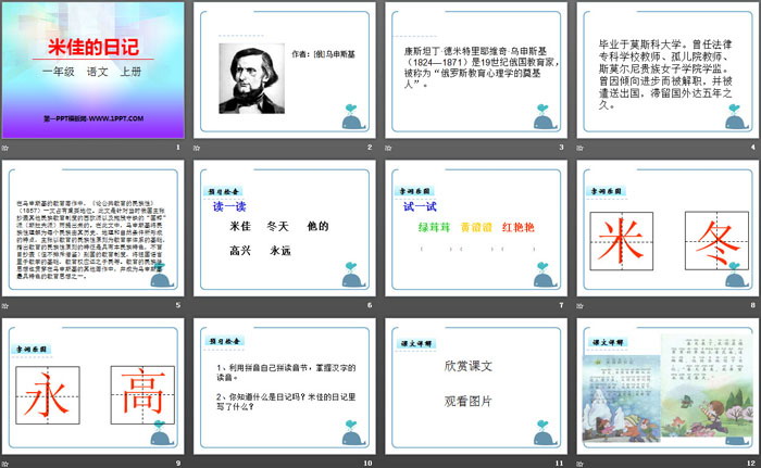 关键词:湘教版一年级上册语文PPT课件免费下载,米佳的日记PPT下载,.PPT格式;