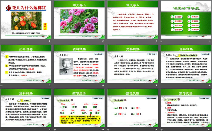 了解事理说明文的基本特点,了解课文从不同角度介绍了有关花朵为什么呈现红色和 其他颜色的科学知识。