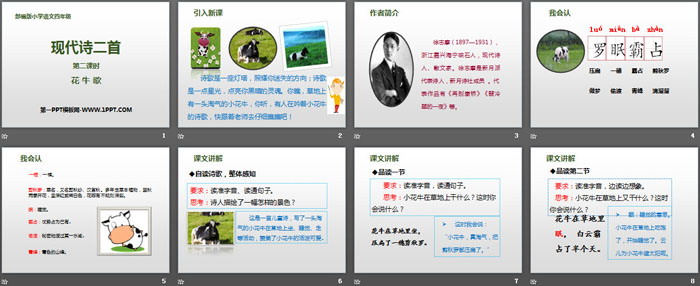 诗歌是一座灯塔,照耀你迷失的方向;诗歌是一点星光,点亮你黑暗的灵魂。你瞧,草地上有一头淘气的小花牛,你听,有人在吟着小花牛的诗歌,快跟着老师去仔细瞧瞧吧!