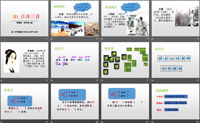 关键词:部编人教版四年级上册语文PPT课件免费下载,古诗三首PPT下载,凉州词PPT下载,出塞PPT下载,夏日绝句PPT下载,.PPT格式;