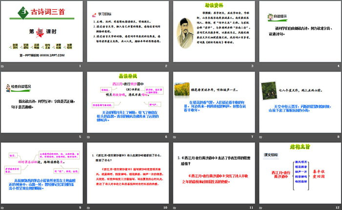 3. 通过语言文字的训练,感受词中所表现的自然美,感悟作者热爱大自然,关心人民,期盼丰年的思想感情。