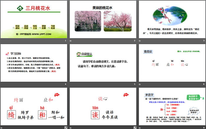 4.抓住优美的语言,理解课文内容,了解“桃花水”的特点,感受春天的美景和勃勃生机,激起对大自然的热爱之情。(重点)