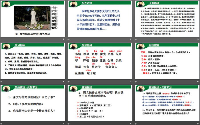 本课是革命先驱李大钊烈士的女儿李星华在1943年写的,这年正值李大钊同志遇难16周年,所以文章题目叫《十六年前的回忆》。这篇回忆录,把我们带到那腥风血雨的年代……