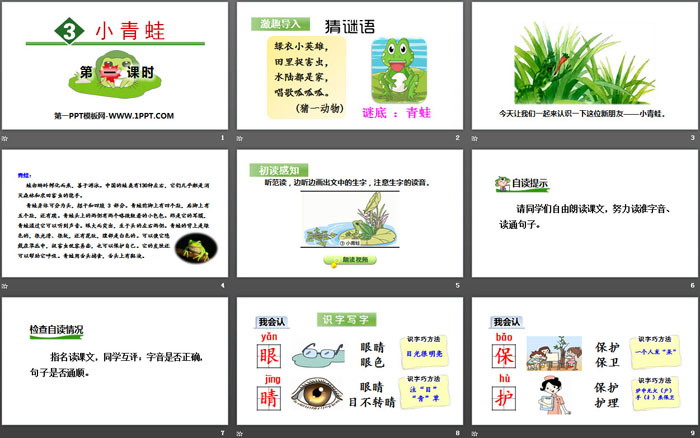 2.朗读指导:全文要读的有节奏,重读“清清、大眼睛、吃、做、爱护等词语,读出对小青蛙的喜爱之情。