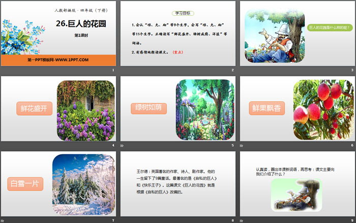 王尔德:英国著名的作家、诗人、剧作家。他的一生留下了9篇童话。最著名的是《自私的巨人》和《快乐王子》。这篇课文《巨人的花园》就是根据《自私的巨人》改编的。