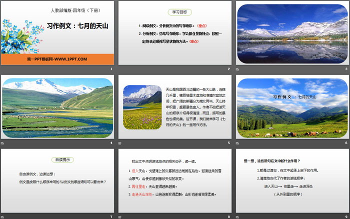 关键词:部编人教版四年级语文下册PPT课件免费下载,习作例文PPT下载,七月的天山PPT下载,.PPT格式;
