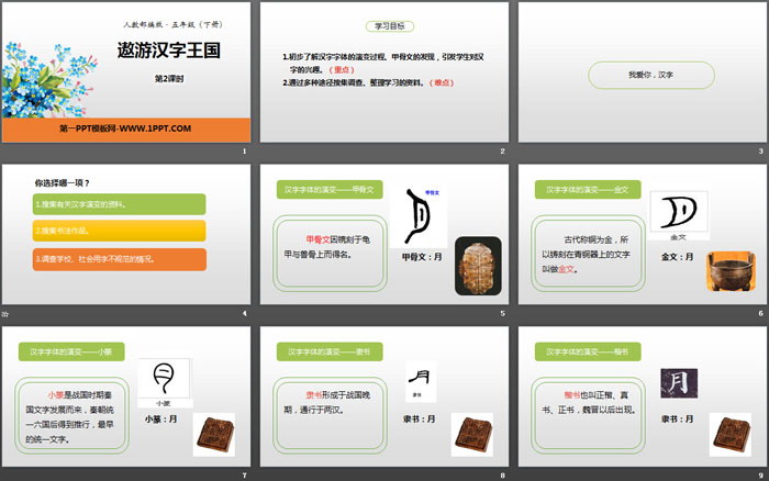 1.初步了解汉字字体的演变过程、甲骨文的发现,引发学生对汉字的兴趣。(重点)