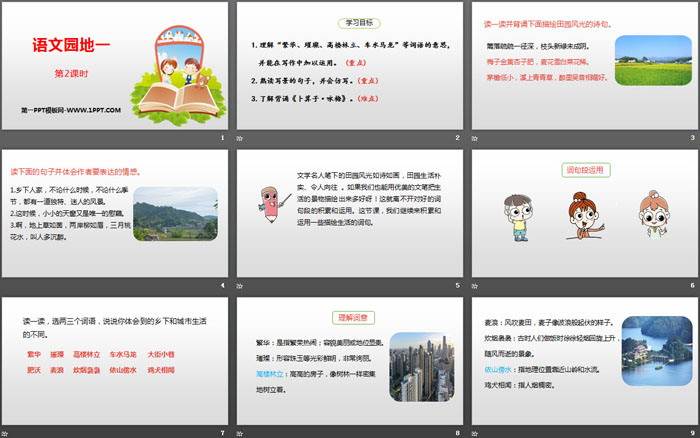 文学名人笔下的田园风光如诗如画,田园生活朴实、令人向往 。如果我们也能用优美的文笔把生活的景物描绘出来多好呀!这就离不开对好的词句段的积累和运用。这节课,我们继续来积累和运用一些描绘生活的词句。