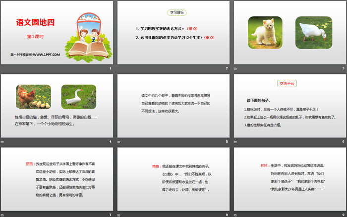 艳艳:我还能在课文中找到其他的例子。《白鹅》中,“我们不胜其烦,以后便将饭罐和水盆放在一起,免得它走远去,让鸡、狗偷饭吃”。