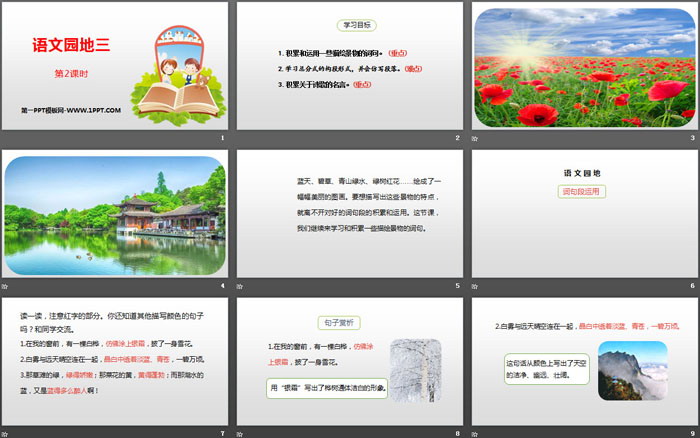 蓝天、碧草、青山绿水、绿树红花……绘成了一幅幅美丽的图画。要想描写出这些景物的特点,就离不开对好的词句段的积累和运用。这节课,我们继续来学习和积累一些描绘景物的词句。