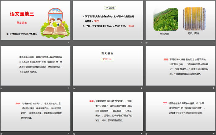 1.学习不同诗人描绘景物的方法,从诗句中体会他们表达的情感。(难点)