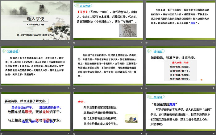 关键词:部编人教版七年级语文下册PPT课件免费下载,逢入京使PPT下载,.PPT格式;