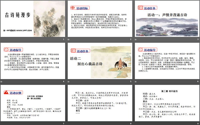3、通过此次活动,激发用多种艺术形式解读古诗词的热情,树立自信心,通过漫步古诗苑,体验到成功的喜悦,培养交流与合作的能力。