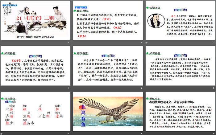 关键词:部编人教版八年级语文下册PPT课件免费下载,庄子二则PPT下载,北冥有鱼PPT下载,庄子与惠子游于濠梁之上PPT下载,.PPT格式;