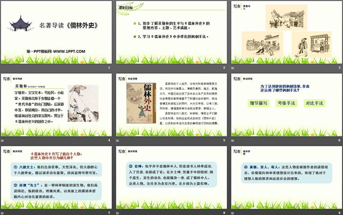 1.初步了解吴敬梓的生平与《儒林外史》的思想内容、主题、艺术成就。