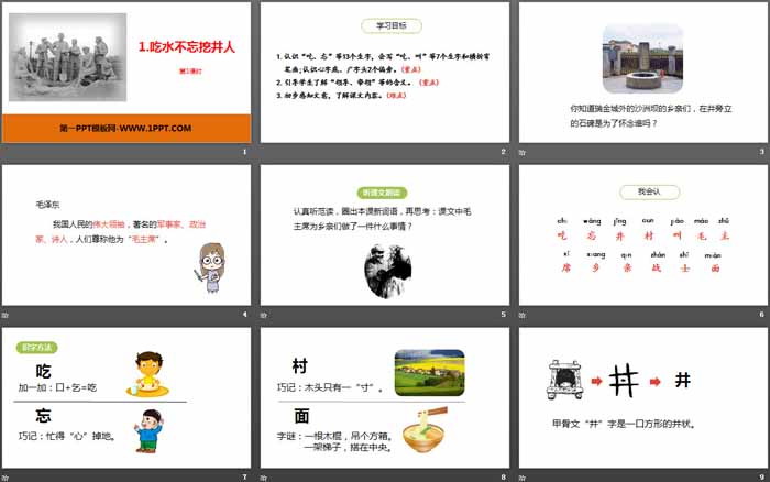 关键词:部编人教版一年级语文下册PPT课件免费下载,吃水不忘挖井人PPT下载,.PPT格式;