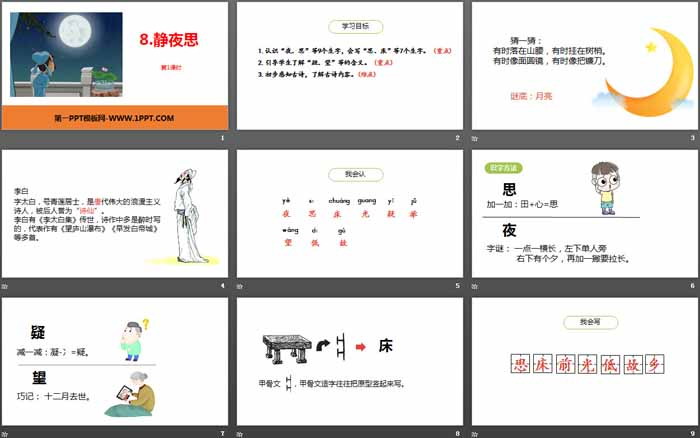 1.认识“夜、思”等9个生字,会写“思、床”等7个生字。 (重点)