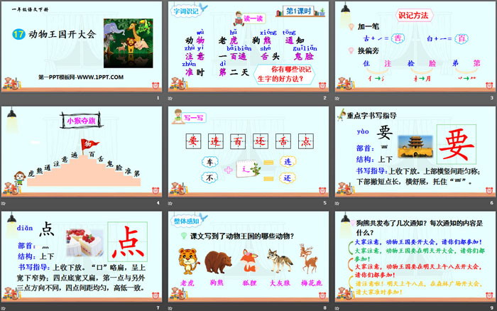 关键词:部编人教版一年级语文下册PPT课件免费下载,动物王国开大会PPT下载,.PPT格式;
