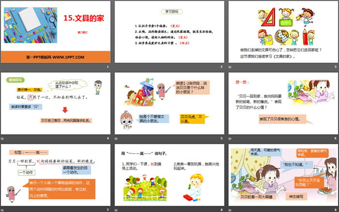 被我们丢掉的文具可伤心了,怎样把它们送回家呢?这节课我们继续学习《文具的家》。
