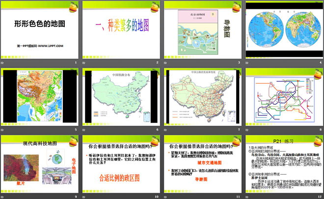 关键词:上海教育版六年级上册地理PPT课件免费下载,形形色色的地图PPT下载,.PPT格式;