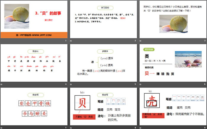 同学们,你们看见过贝壳吗?小贝壳这么美丽,那你知道有关“贝”的汉字吗?让我们走进课文了解一下吧!