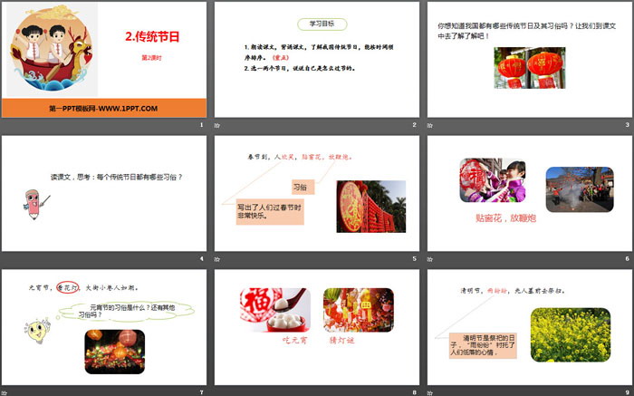 1.朗读课文,背诵课文,了解我国传统节日,能按时间顺序排序。 (重点)
