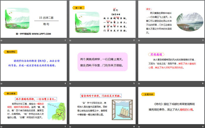 朗读指导:注意读出诗的节奏感与韵律感。 如“两个/黄鹂/鸣翠柳,一行/白鹭/上青天”。