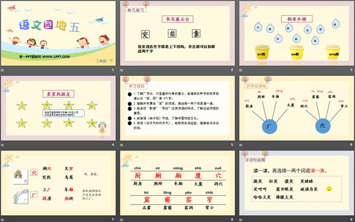 1.了解厂字头、穴宝盖所代表的意义;能借助形声字的构字规律认识“厨、厕”等 9个字。