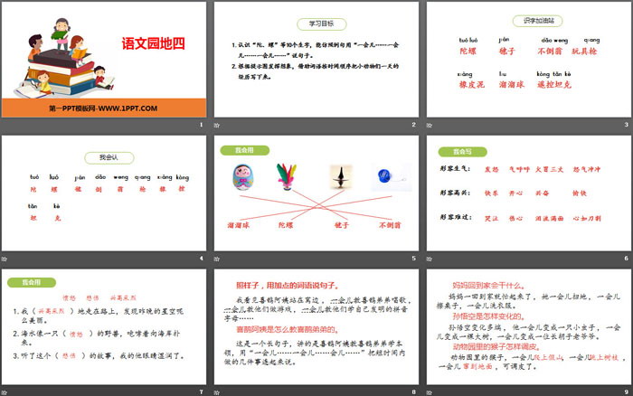 1.认识“陀、螺”等10个生字,能仿照例句用“一会儿……一会儿……一会儿……”说句子。
