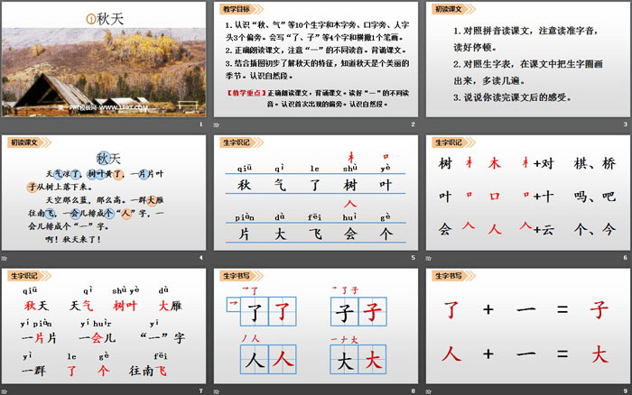 1.认识“秋、气”等10个生字和木字旁、口字旁、人字头3个偏旁。会写“了、子”等4个字和横撇1个笔画。
