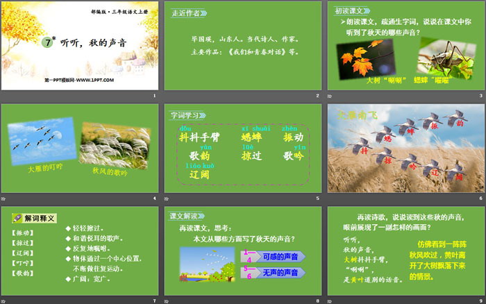 关键词:部编人教版三年级上册语文PPT课件免费下载,听听秋的声音PPT下载,.PPT格式;