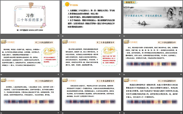 1.大胆想象二十年后家乡人、事、景、物的巨大变化,学习用人事景物表达对家乡的热爱、怀念之情。