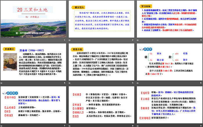 关键词:部编人教版六年级上册语文PPT课件免费下载,三黑和土地PPT下载,.PPT格式;