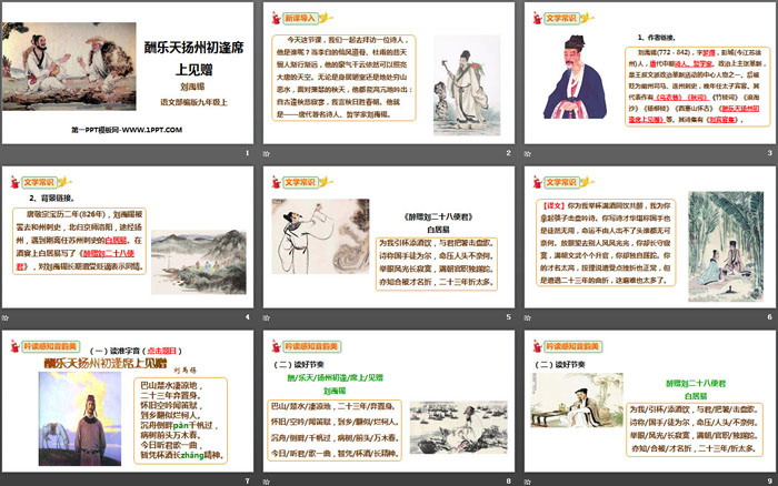 关键词:部编人教版九年级上册语文PPT课件免费下载,酬乐天扬州初逢席上见赠PPT下载,诗词三首PPT下载,.PPT格式;